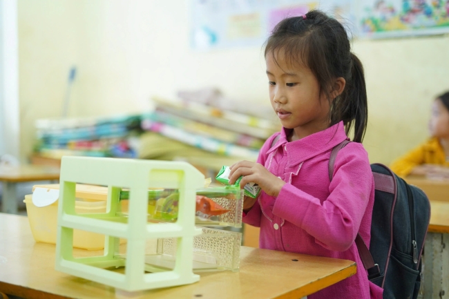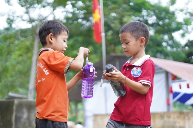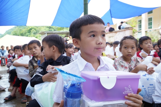 Niềm vui của các em nhỏ vùng cao hiện rõ trong ánh mắt khi lần đầu tiên được cầm trên tay những món đồ học tập mới. Em Sùng Văn Chính (học sinh lớp 3) chia sẻ sự háo hức khi nhận bình nước để đựng nước và mang đến lớp mỗi ngày. Em Hồ Yu Lan (học sinh lớp 4) không giấu nổi niềm vui khi được khám phá chiếc tủ Tomi đựng dụng cụ học tập – một vật dụng mà em chưa từng được sở hữu trước đây.