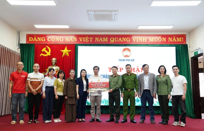 Đại diện Ủy ban MTTQ Việt Nam TP Huế tiếp nhận sự ủng hộ từ Cục V05 và các đoàn thiện nguyện ngày 14/11/2025