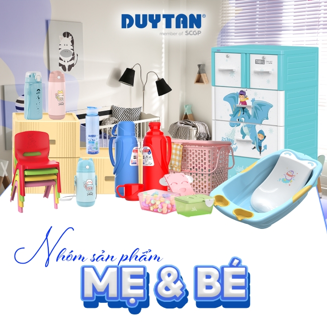 🔹 Sản phẩm Mẹ và Bé: Hiểu được nhu cầu chăm sóc con yêu của các bà mẹ, Nhựa Duy Tân cung cấp dòng sản phẩm nhựa an toàn, tiện dụng và thân thiện với trẻ nhỏ. Từ kệ đẩy, thau tắm đến bình thủy, giỏ nắp, tất cả đều được sản xuất từ nhựa an toàn, không chứa BPA, với màu sắc sinh động giúp mẹ yên tâm chăm sóc bé yêu từ những chi tiết nhỏ nhất.